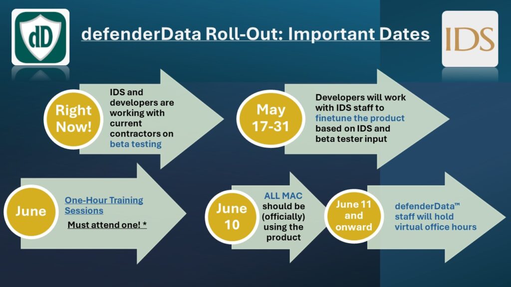 June 3-7: Training: defenderData and IDS staff will provide multiple one hour training sessions for MAC attorneys. IDS will provide log-in credentials once you have completed a training session. All you need to do is choose the date and time that works best for you to log in.